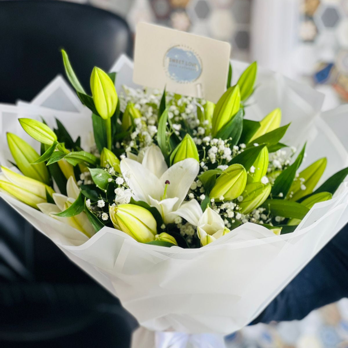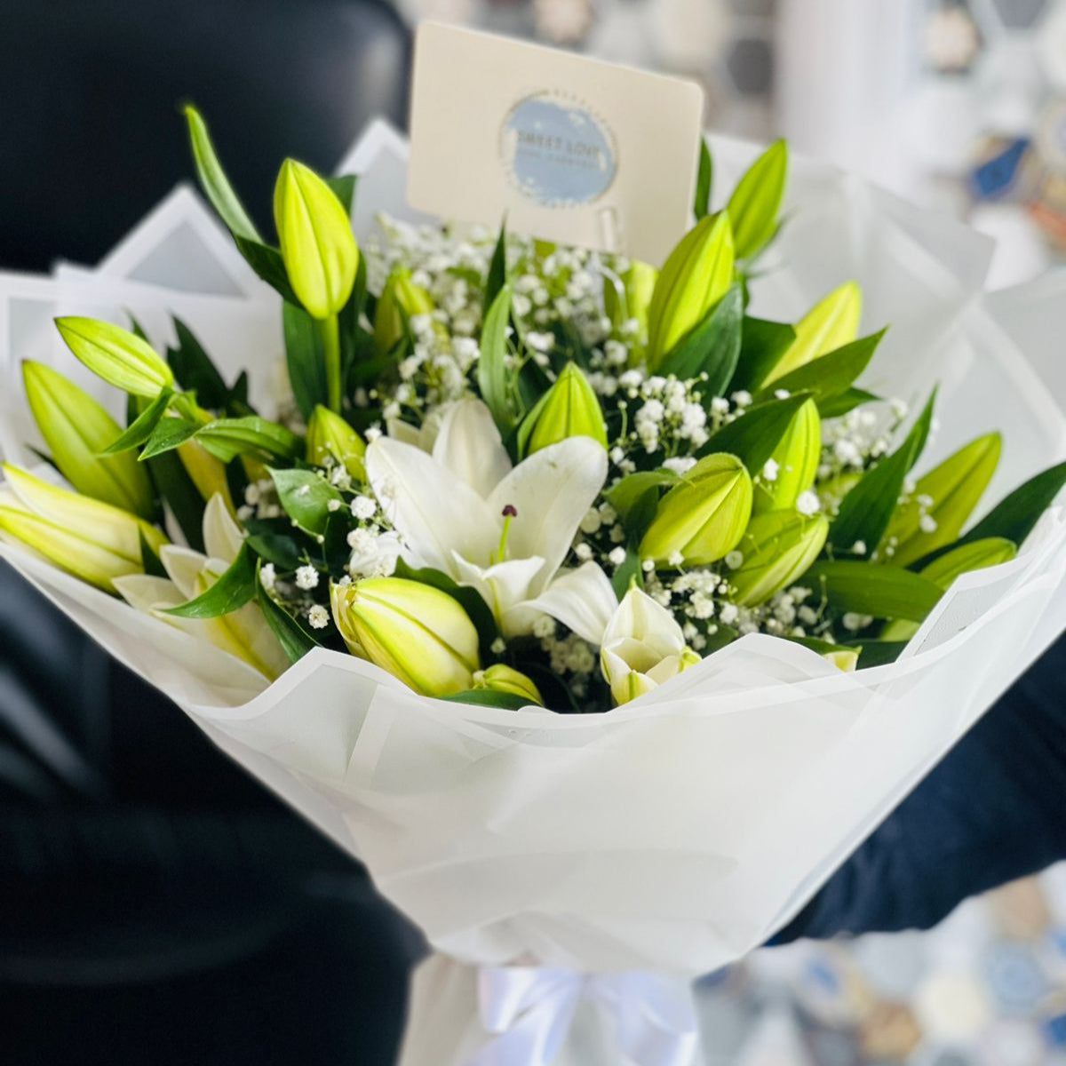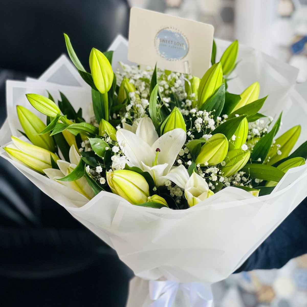 باقة خلابة من 8 زنابق بيضاء نقية، مقترنة بجبسوفيلا رقيقة، ومغلفة بورق أبيض أنيق. هذه الباقة الرائعة تنضح بالنقاء والبراءة والرقي، مثالية لحفلات الزفاف، واحتفالات الذكرى السنوية، والمناسبات الخاصة.