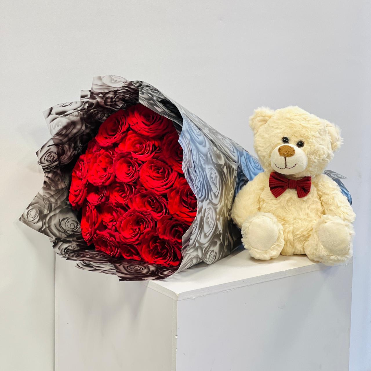 وردة حمراء مكونة من 20 ساقًا مغلفة بغلاف أسود مزين بنقوش زهرية، بالإضافة إلى دمية دب صغيرة لطيفة وبطاقة معايدة لعيد الحب.