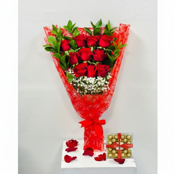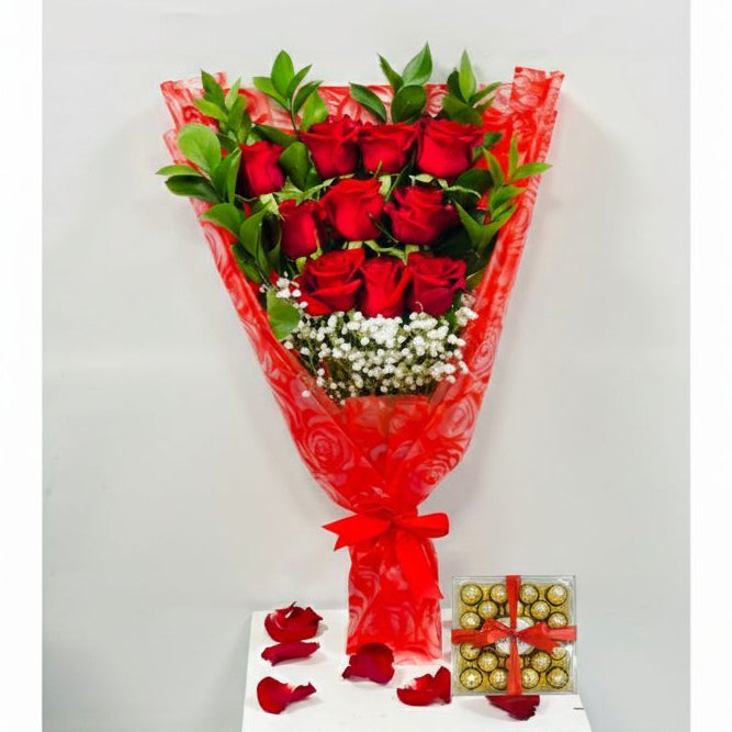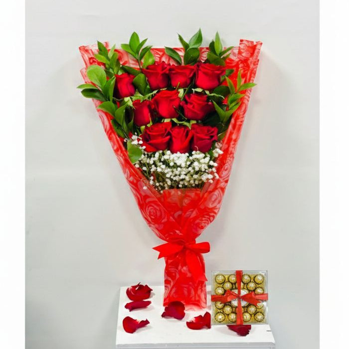 باقة من 10 ورود حمراء مع الجيبسو والروسكوس، مغلفة بغلاف مطبوع عليه زهور حمراء، مع علبة شوكولاتة فيريرو روتشر مكونة من 24 قطعة وبطاقة معايدة لعيد الحب.